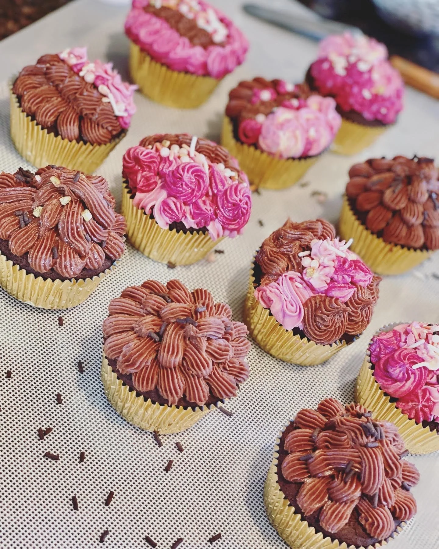 In the meantime, I made some paleo chocolate cupcakes to use up some chocolate ganache buttercream and the beet dyed American buttercream from last weekend’s cake to work on my piping. I wasn’t thrilled with the result until I realized I was using the wrong tip! Oy.