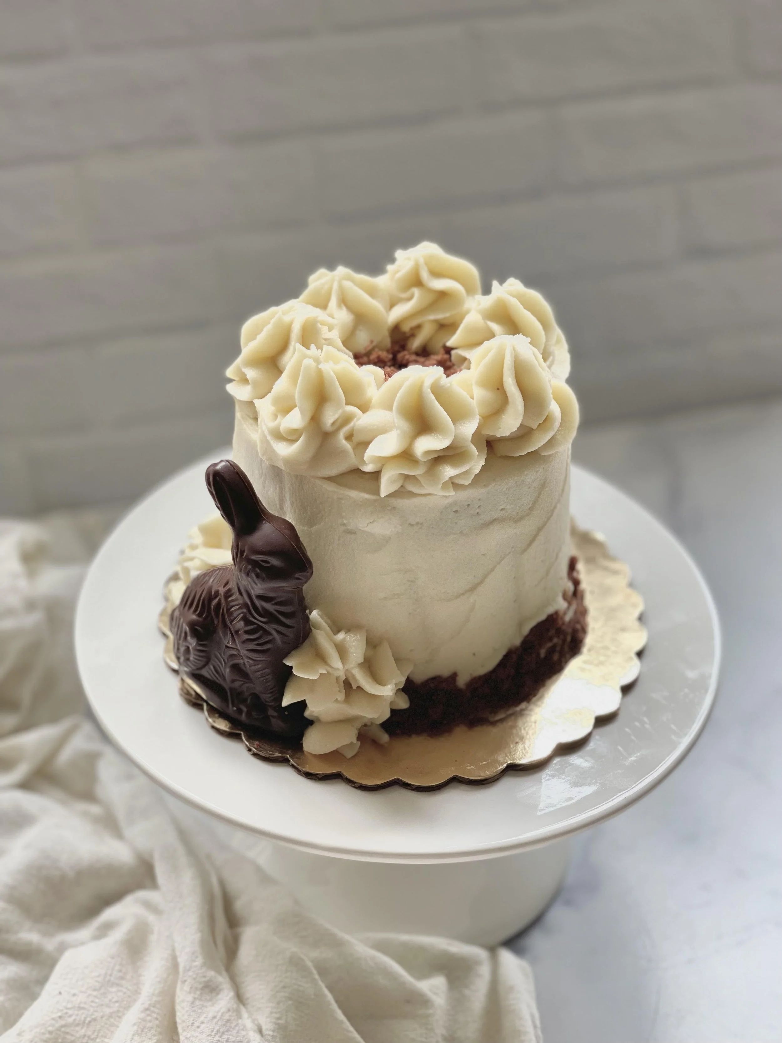 I finished this Mini Cake with lots of extra cream cheese frosting and an organic, free trade Lake Champlain dark chocolate baby bunny. The recipient of this cake said she loved frosting so I defied the laws of cake physics by torting the mini layers and getting as much cream cheese buttercream in there as possible. By request, this one was also made with the real deal – grass fed butter and real cream cheese instead of a vegan alternative I’d use for a dairy free cake.