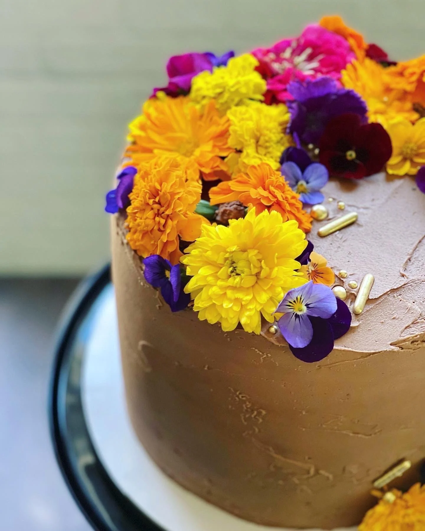 This is a six layer gluten, dairy and refined sugar free Black Cocoa Cake + Dark Chocolate Ganache Buttercream finished with fresh flowers and some gold dragées that was served alongside cupcakes from Little Red Hen – Altadena's oldest Black woman owned business. The black cocoa cake is very similar to a devil’s food cake which I learned has some significance for many African Americans. The joyous colors of these flowers just felt right.