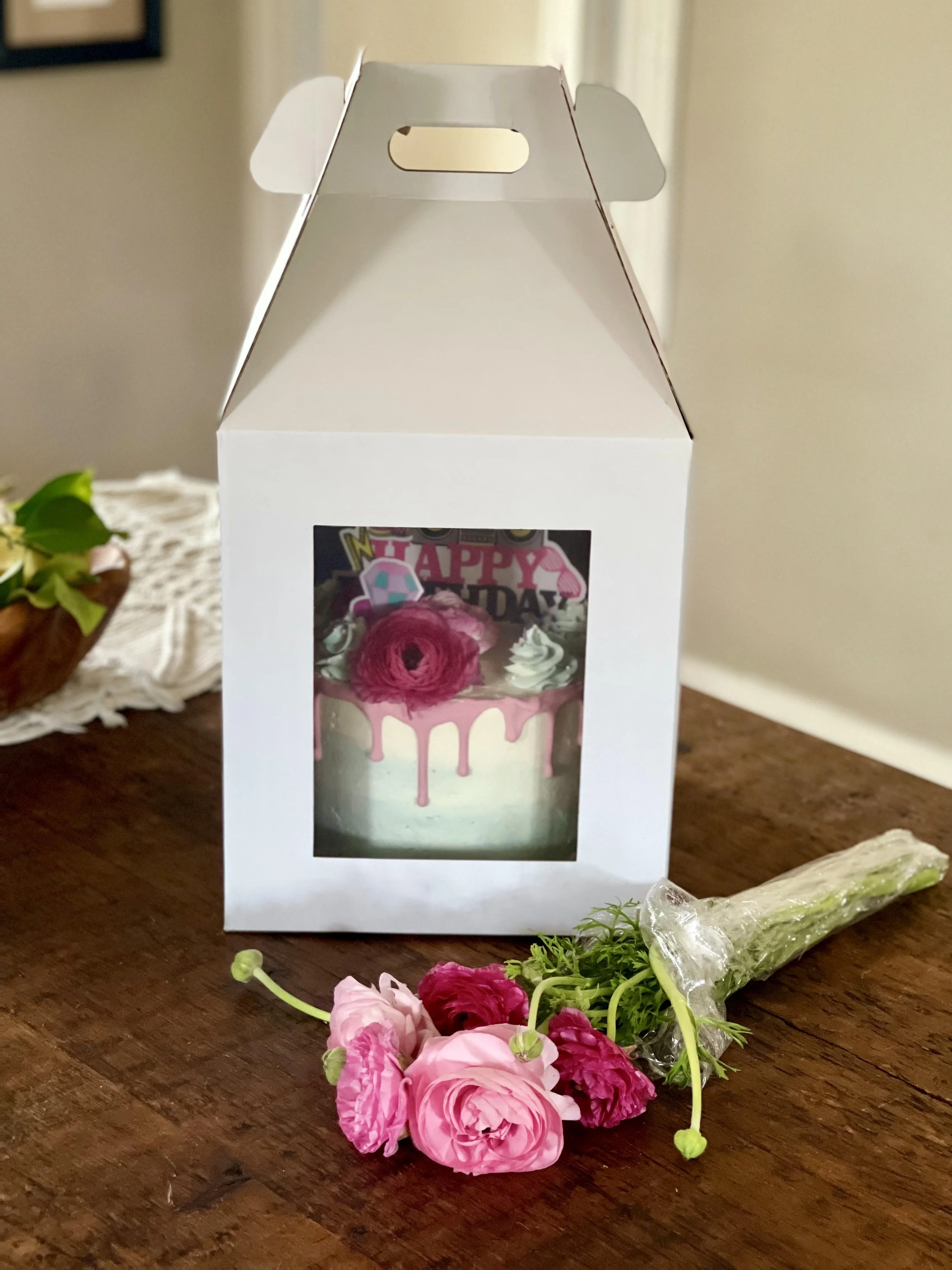 These cake boxes are the greatest! Cakes arrive the way they left, even with the way I drive. But you never know what may happen in the box in transit, so I always try to send cakes with fresh flowers on their way with a few extras – just in case. ;)