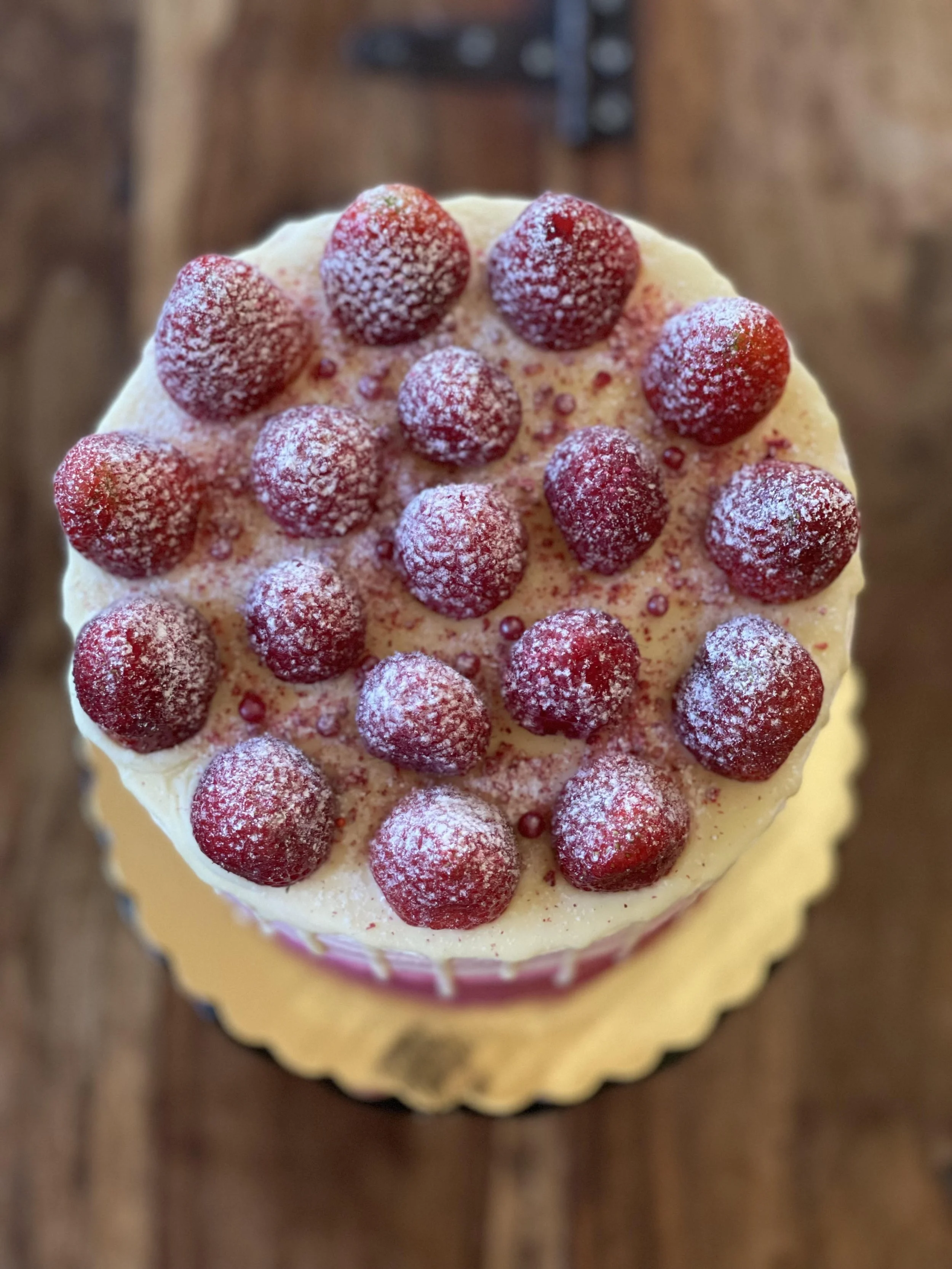 Finished with a white chocolate ganache drip, and topped with fresh strawberries and raspberries, dehydrated raspberry dust, a smattering of fancy sprinkles and a light dusting of powdered sugar.