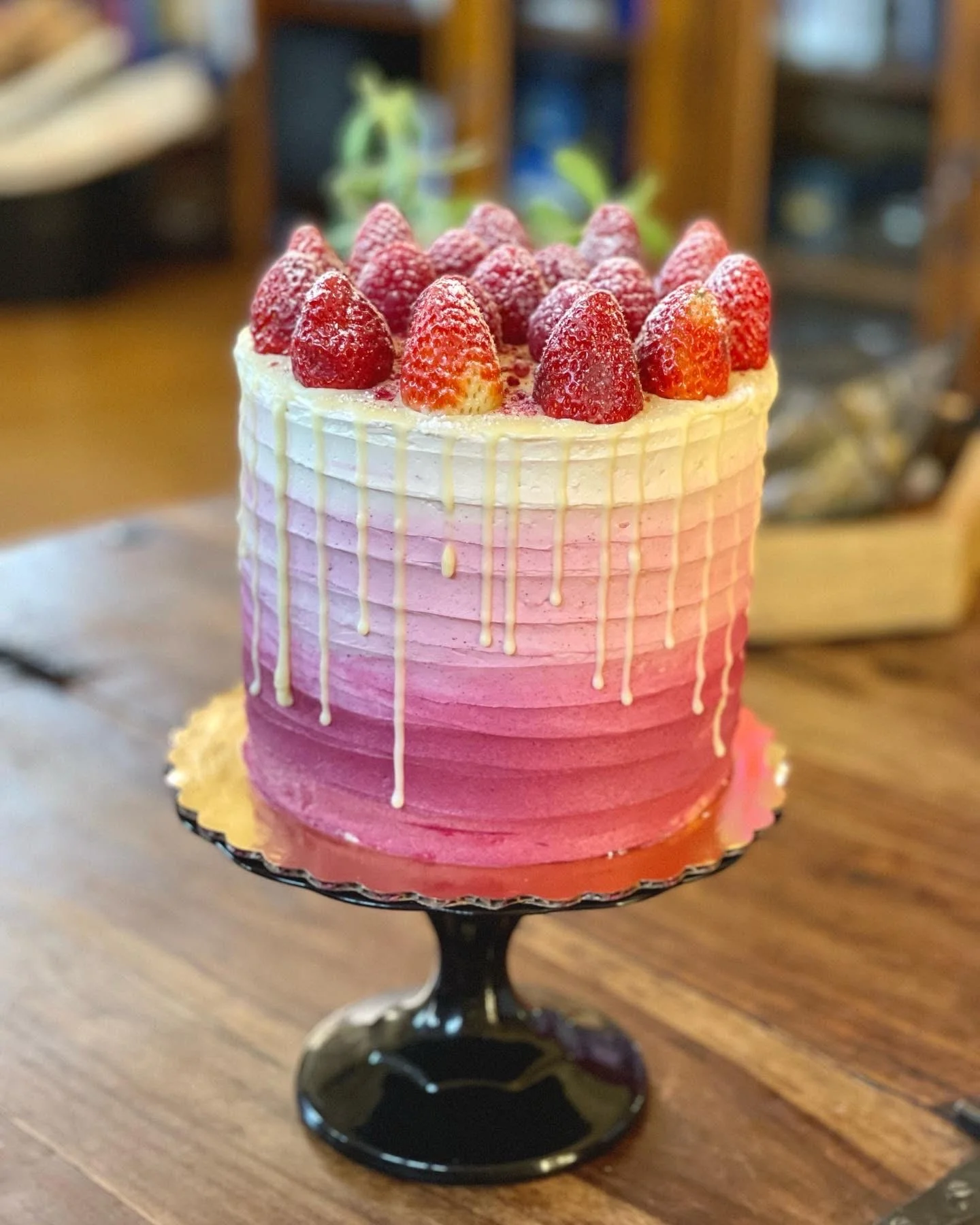 Four layers of blackberry studded brown sugar vanilla cake, with three strawberry Swiss meringue buttercream layers, and a citrus scented raspberry pink ombré American buttercream exterior colored with natural pomegranate and beet root plant dyes.
