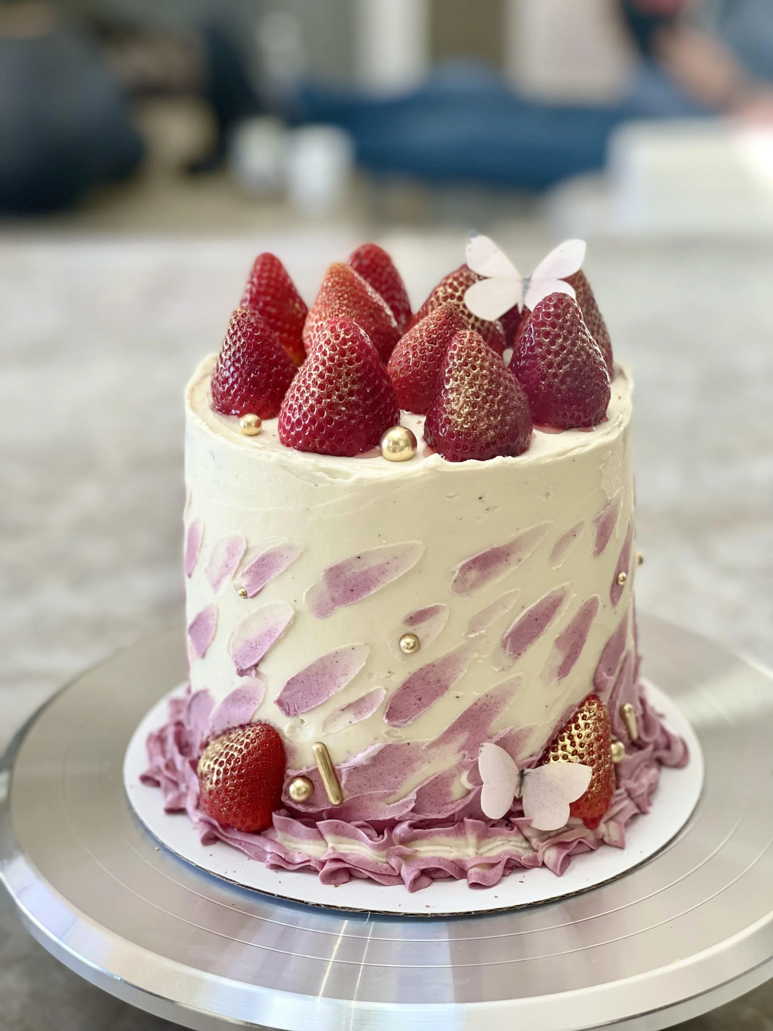 This is a 6” three layer chocolate cake filled with buttercream and fresh strawberries and finished with American buttercream tinted with a bit of beet root powder, more fresh berries, gold dragées, a couple of wafer paper butterflies, and some more gold gilding. Have I mentioned I love using gold? True story.