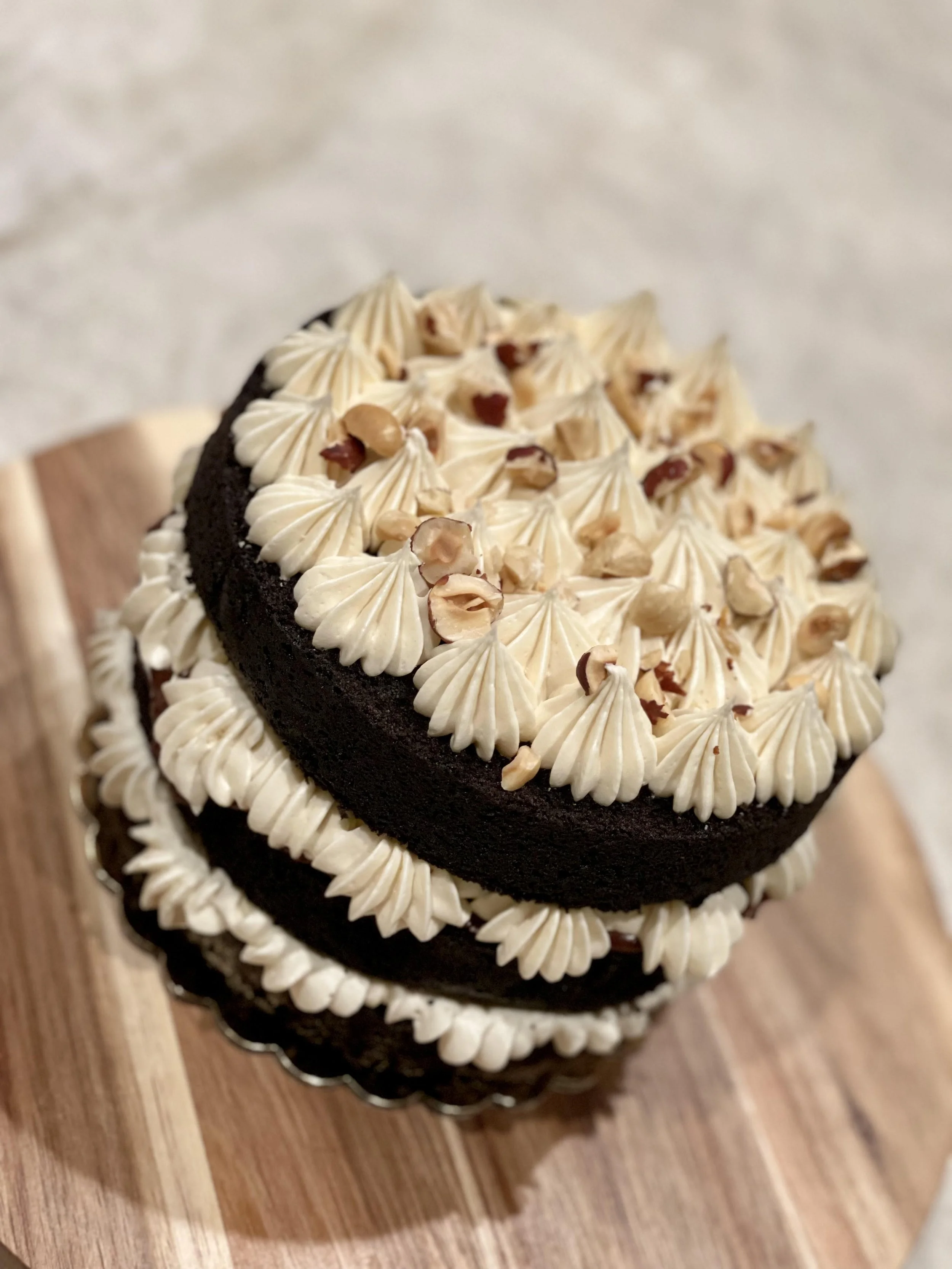 This cake couldn’t be simpler. It’s three 6” layers of my black cocoa cake made with olive oil instead of avocado and layered with a generous shmear of the Clean Made Notella, piped vanilla bean cream cheese buttercream, then topped with some chopped hazelnuts. Simple but visually striking.