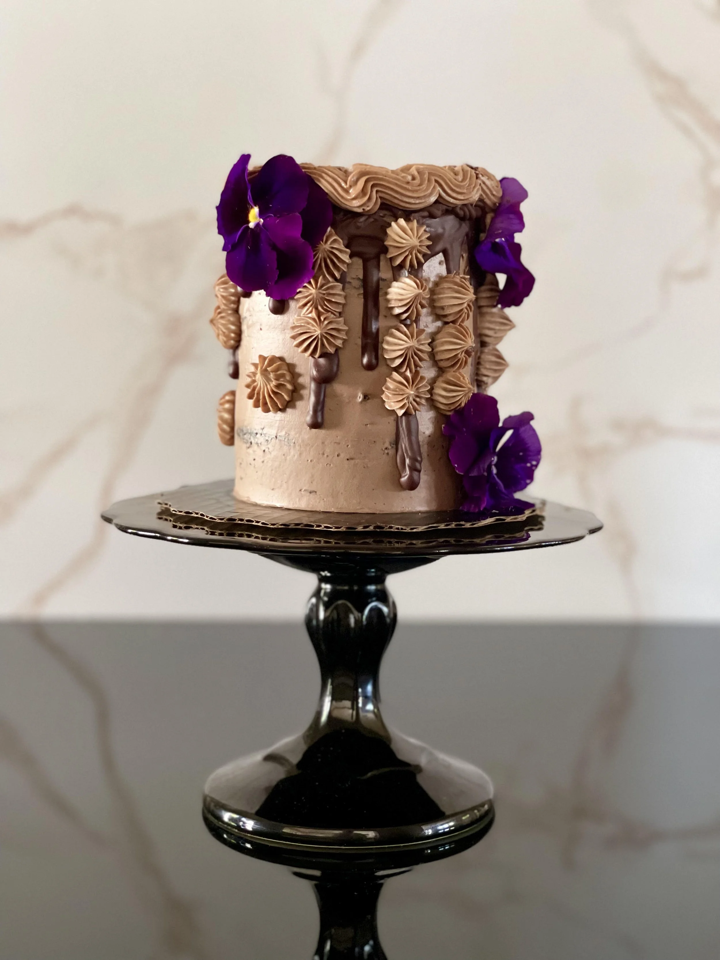 This is a 4” three layer Black Cocoa Cake + Dark Chocolate Buttercream + Valrhona Shavings