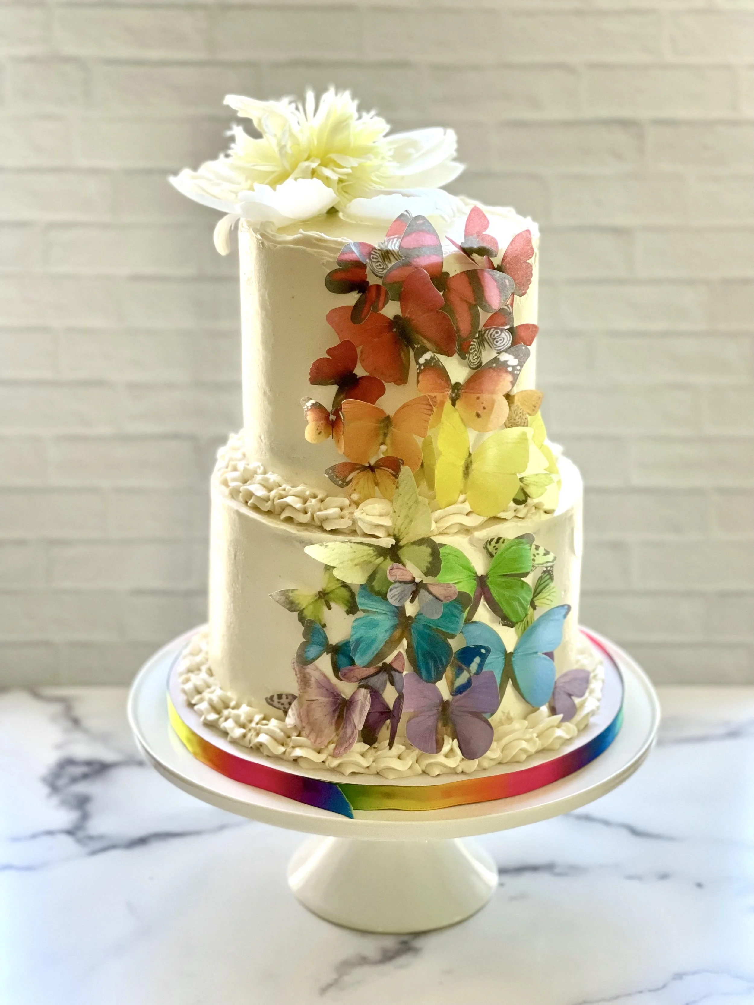 This vanilla bean cake is made of two six layer tiers - a 6” cake on top of an 8” cake and and finished with vanilla bean buttercream, wafer paper butterflies and a peony flower.