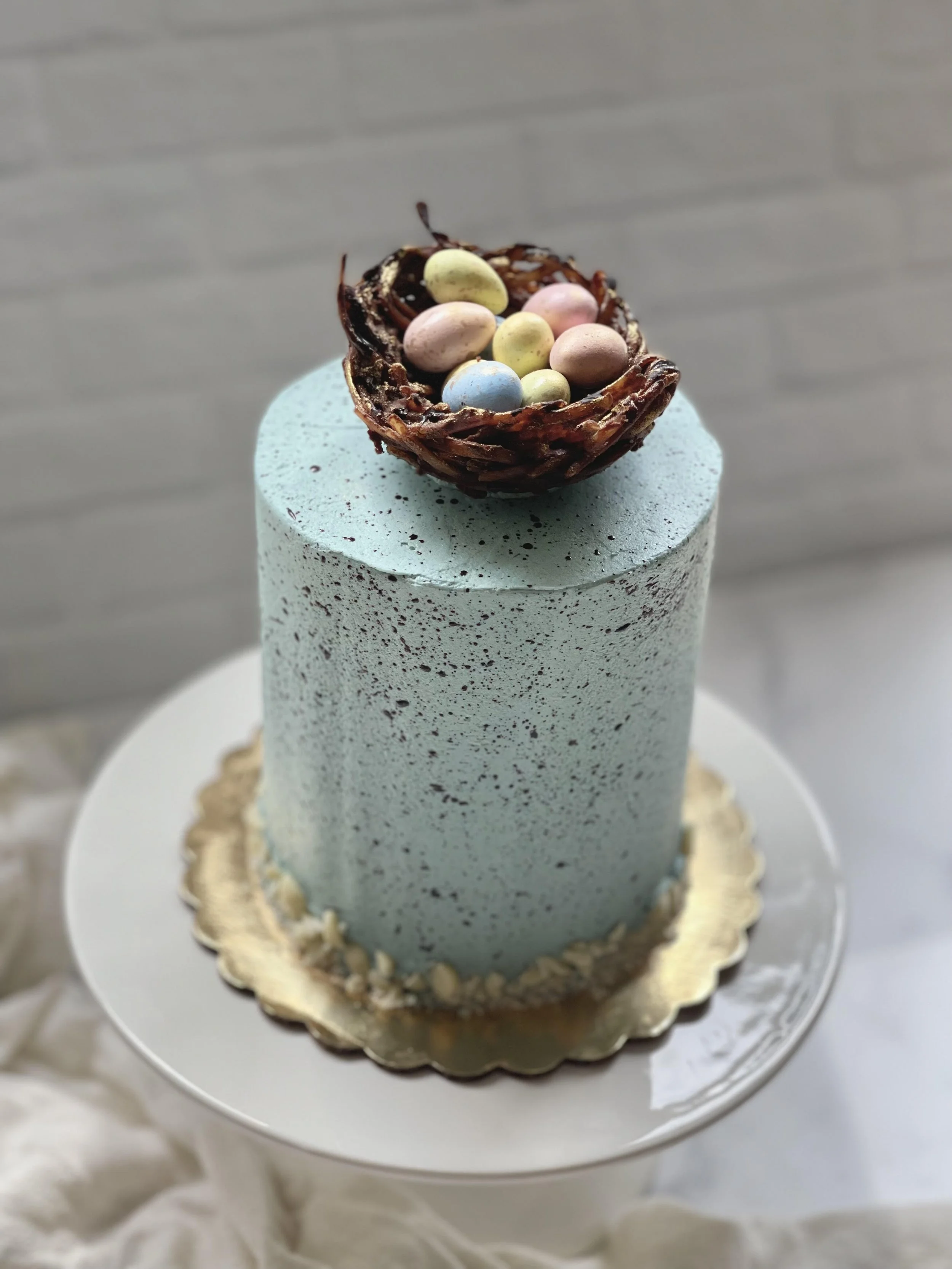 The nest was made with Banza chickpea linguine lightly blanched in boiling water, mixed with Enjoy Life’s Dark Chocolate Mega Chunks, and formed into nest shapes using two small bowls. The speckled finish couldn’t be easier. Just mix a tablespoon of black cocoa with a teaspoon of very good vanilla and apply by carefully spattering the mix with a small paintbrush. Filled the nest with organic chocolate covered almonds in pastel candy shells. A little gold lustre powder on the eggs and nest to tie it all together. Because, gold lustre is my jam.