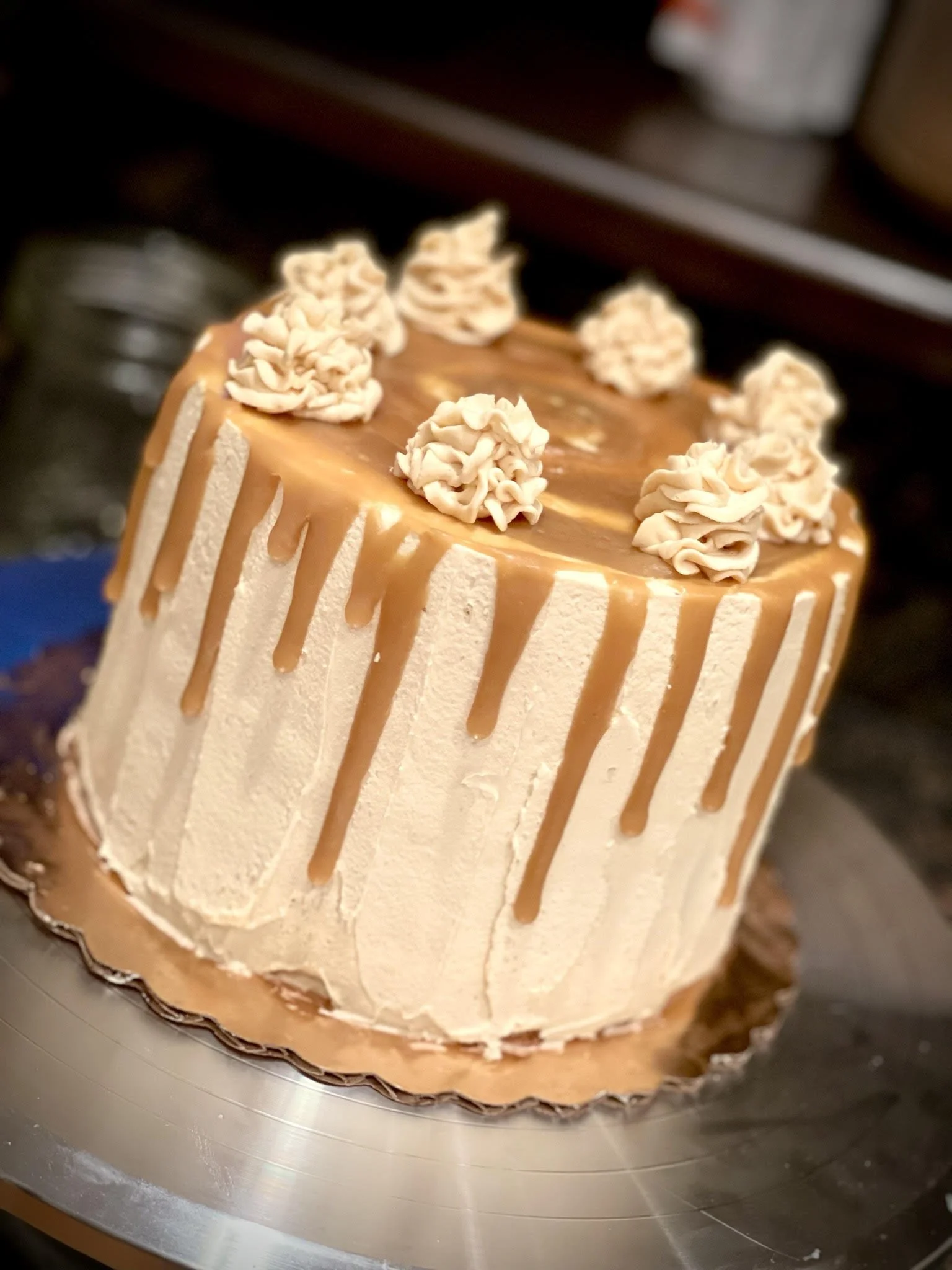 This is a caramel cake adapted from Rosalind Miller's caramel cake recipe made gluten, dairy AND refined sugar free, with layers of salted caramel American buttercream, a salted caramel drip topped with some cake crumbles and a ring of dark caramel. The crumbles were a fun addition but I preferred the look before adding them. Also found myself wishing I had more salted caramel left to do a full pour over on one of the cakes instead of a drip, but c'est la vie. Next time.